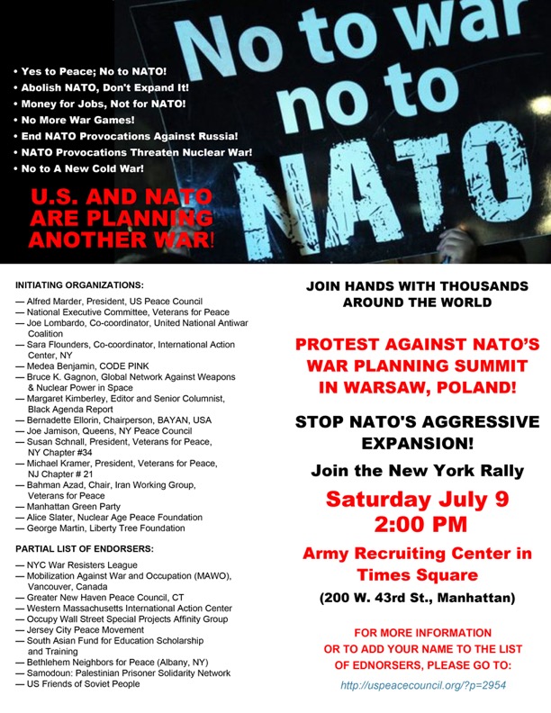 July 9th New York Ralley: Stop NATO’s Expansion No to war - no to NATO Network Posted on June 27, 2016 by kristineJune 27, 2016