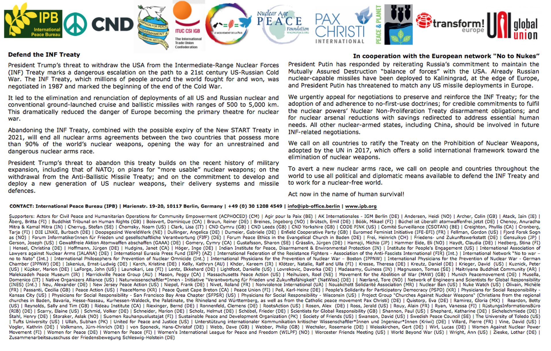 This appeal was published in the Guardian December 10th 2018. The international network “No to war – no to NATO” signed it also.